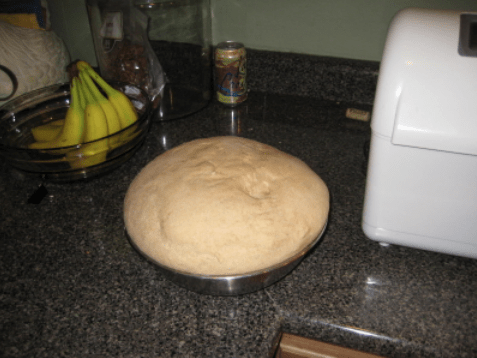 That’s my bread machine to the right. I don’t actually bake the bread in it. I use it to knead the dough, which it does far more efficiently than I can.