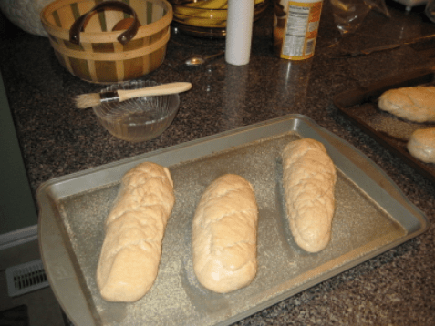 Anyway, I cut up that big mass of dough into six loaves. I rolled the smaller dough wads out and placed them on a baking sheet sprinkled with cornmeal (this prevents the dough from sticking).