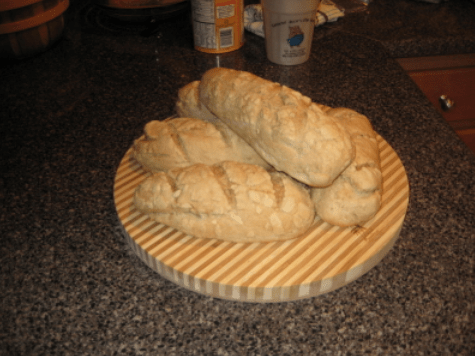 I always put a tin of water in the oven to produce a more damp heat. In this way, I make sure the crust doesn’t come out too dry or hard. After a half hour in 375〫heat, I pull out a half dozen beautiful loaves.